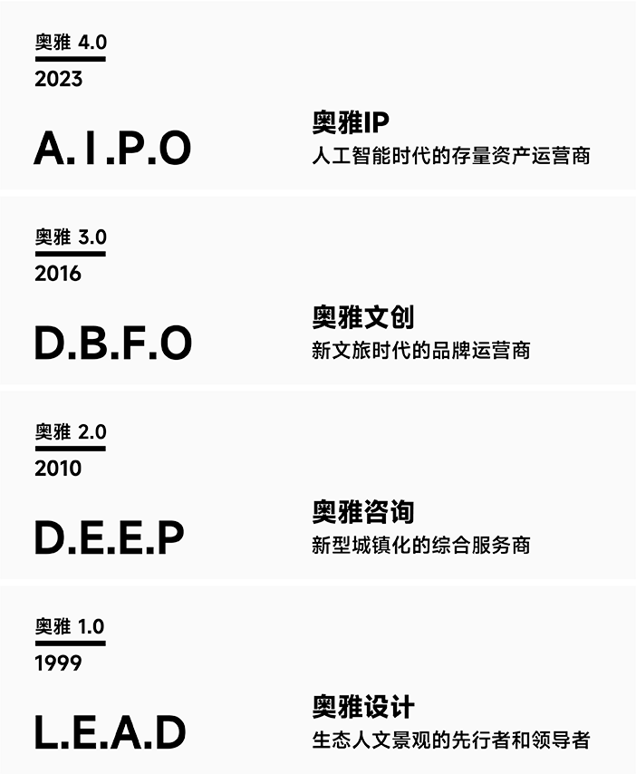 經(jīng)過多年的戰(zhàn)略布局與發(fā)展,在李方悅女士的推動下,奧雅股份從一家設計企業(yè)成功轉(zhuǎn)型成為新銳的輕資產(chǎn)文旅開發(fā)運營企業(yè)。奧雅以“創(chuàng)造更美好的人居環(huán)境”“讓空間賦予生命”為使命,以雙輪驅(qū)動+雙引擎為發(fā)展格局,即創(chuàng)意設計+親子文旅雙輪驅(qū)動、AIGC+IP雙引擎;經(jīng)營業(yè)務范圍涵蓋創(chuàng)意設計、親子文旅、數(shù)字科技等領(lǐng)域,為城市更新、鄉(xiāng)村振興、文化古城等不同場景提供全程化咨詢與綜合運營服務。在實現(xiàn)企業(yè)價值和理想的同時,解決當代中國的實際問題與需求,創(chuàng)造具有地域特色、人性化和充滿活力的新舊城市空間和綜合文化旅游項目。